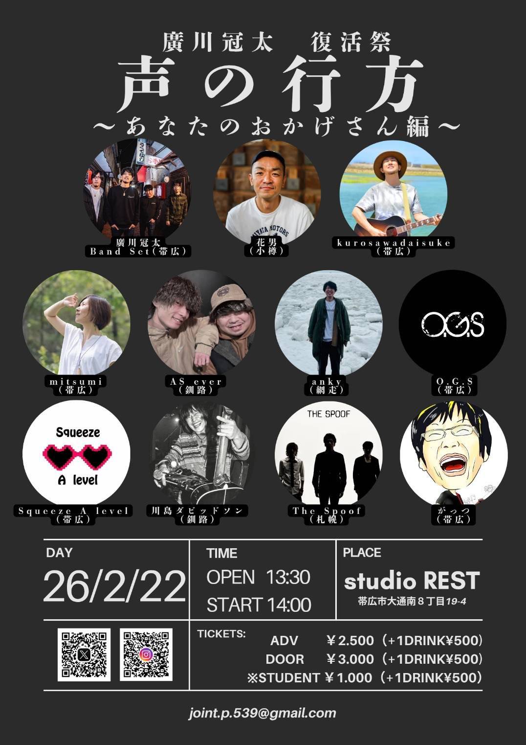 AS ever(釧路) anky(網走) 川島ダビッドソン(釧路) The Spoof(札幌) 廣川冠太 Band Set(帯広) kurosawadaisuke(帯広) mitsumi(帯広) O.G.S(帯広) Squeeze A level(帯広) がっつ(帯広)open 13:00