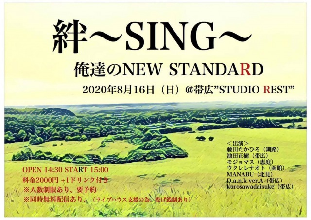 Open 14:30 Start 15:00 料金:2000円(1ドリンク付き) ※人数制限あり、要予約 ※同時無料配信あり、(ライブハウス支援の為、投げ銭制あり) (配信スタート15:00) ※配信サイトはこちら”Save music place”にて https://www.facebook.com/Save-Music-Place-112259363783038 ※支援投げ銭のお願いはこちらです。 https://passmarket.yahoo.co.jp/event/show/detail/01qgi11144uwq.html |