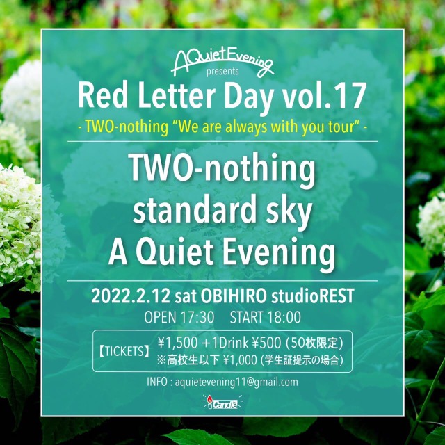 ticket ¥1,500+1drink¥500(50枚限定) 高校生以下¥1,000(学生証提示の場合) INFO:aquietevening11@gmail.com |