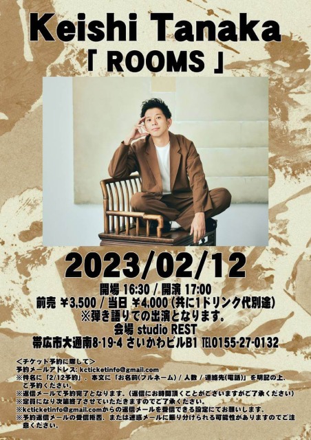 <チケット> 予約メールアドレス: kcticketinfo@gmail.com ※件名に「2/12予約」、本文に「お名前(フルネーム) / 人数 / 連絡先(電話)」を明記の上、ご予約ください。 ※返信メールで予約完了となります。(返信にお時間頂くことがございますがご了承ください) ※定員になり次第終了させていただきますのでご了承ください。 ※kcticketinfo@gmail.comからの返信メールを受信できる設定にてお願いします。 ※予約返信メールの受信拒否、または迷惑メールに振り分けられる可能性がありますのでご注意ください。 |