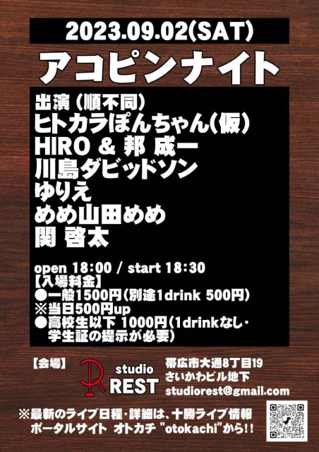 【入場料金】 (前売りのみ・事前予約が必要です) ● 1500円(別途1drink 500円) ● 高校生以下 1000円(1drinkなし) (学生証の提示が必要) |