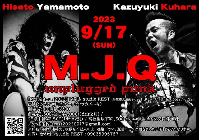 チケット予約→rest20230917@gmail.com ※氏名、年齢、連絡先、枚数をご記入の上、連絡下さい。 返信メールが届きましたら予約完了となります。 お問い合わせ→studio REST:090-3899-5767 |
