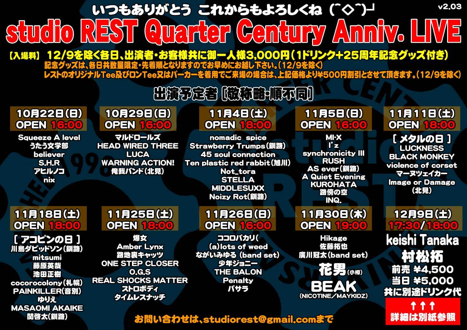 [入場料] 12/9を除く各日、出演者・お客様共に御一人様3,000円(1ドリンク+25周年記念グッズ付き) 記念グッズは、各日共数量限定・先着順となりますのでお早めにお越し下さい。(12/9を除く) レストのオリジナルTee及びロンTee又はパーカーを着用でご来場の場合は、上記価格より¥500円割引とさせて頂きます。(12/9を除く) お問い合わせは、studiorest@gmail.comまで |