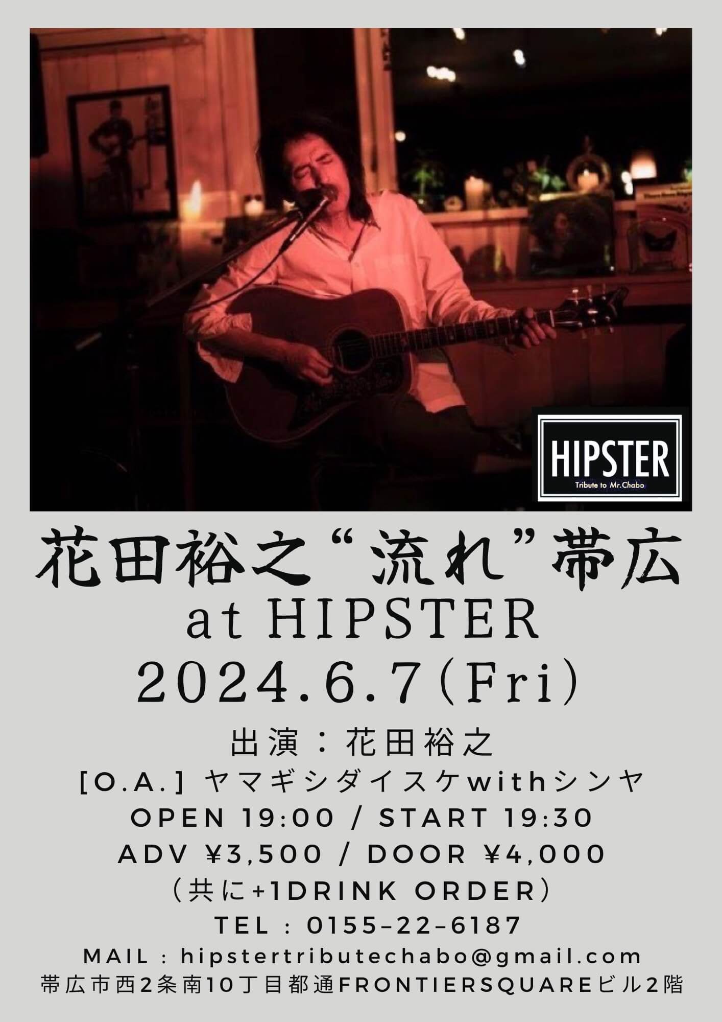 open 19:00 start 19:30 予約 ¥3,500 当日 ¥4,000 いずれも+ 1d order 問い合わせ 0155-22-6187 営業時間 20:00~2:00 メールアドレス hipstertributechabo@gmail.com *イベント中、電話が繋がり難いことがあります。 |