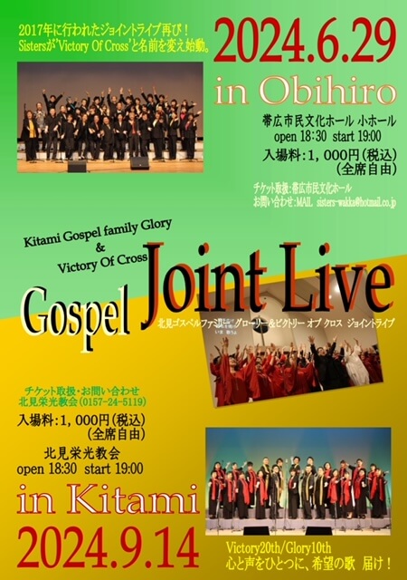 7年ぶりの北見Gloryとのジョイントライブ!総勢45名で希望の歌ゴスペルをお届けします。 ゴスペルクワイアsistersは4月よりヴィクトリーオブクロス(VoC)に改名致しました。 変わらぬ情熱でゴスペルを歌います。 ご来場お待ちしています。 |